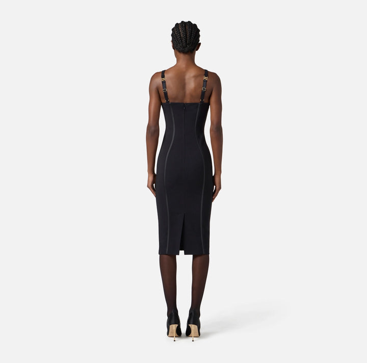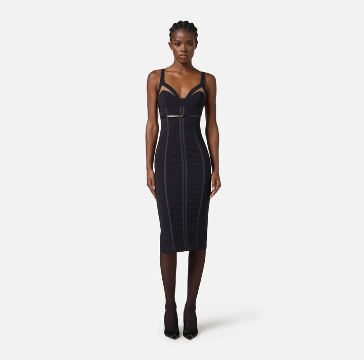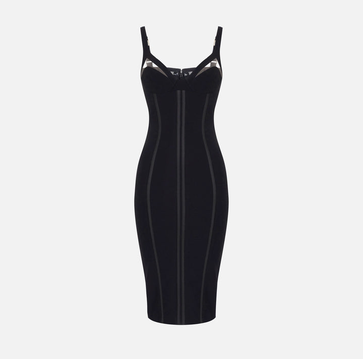 Abito in crêpe leggero dalla vestibilità aderente con spalline regolabili. Il vestito si distingue per i richiami di gusto corsetteria come i nastri in satin impunturati con effetto bustier, a scolpire la silhouette. Le coppe sono definite dai cut-out coperti da spicchi in tulle, per un mirato effetto nude.