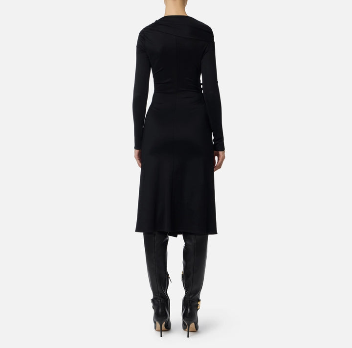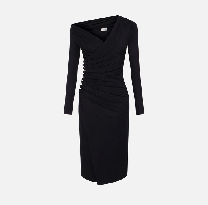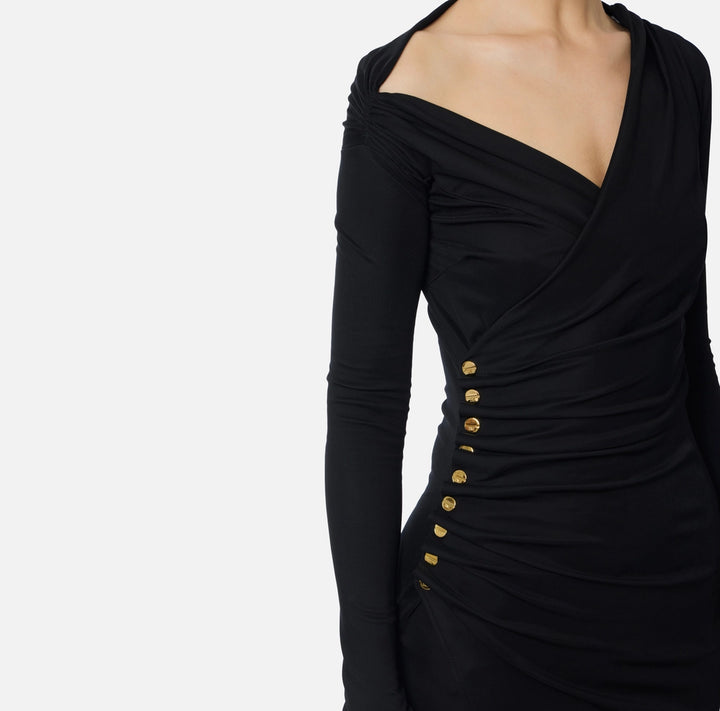 Abito in jersey dalla vestibilità aderente. Il vestito ha maniche lunghe e si distingue per lo scollo asimmetrico che fluisce in un elaborato drappeggio laterale, trattenuto e impreziosito da bottoni in metallo dorato che donano tridimensionalità. Lo spacco laterale aggiunge un'ultima nota audace.