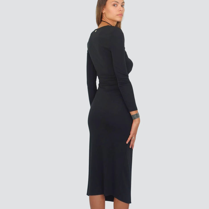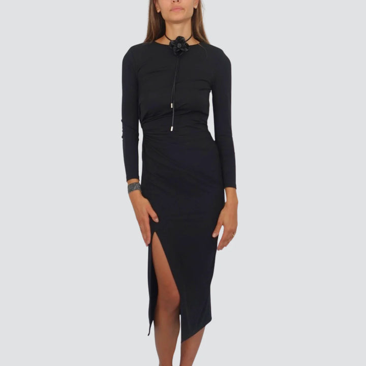 Abito elegante con dettagli sofisticati che catturano lo sguardo. Il tessuto arriccio crea movimento e dinamica, mentre lo spacco laterale regala libertà di movimento e un tocco di sensualità. La collana Art inclusa completa il look con un'eleganza contemporanea, trasformando questo abito in una scelta versatile per occasioni speciali. Perfetto per chi desidera un capo che unisce comfort e stile raffinato, garantendo una silhouette valorizzante e un'impressione indimenticabile.