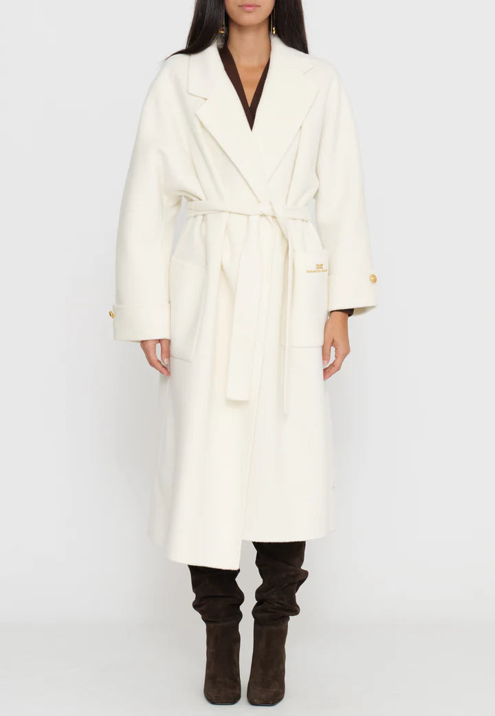 Cappotto a vestaglia in panno di misto lana double, sfoderato e dalla vestibilità over. Con rever, maniche con risvolto e tasche applicate, ha chiusura con cintura per definire il punto vita con morbidezza. L'etichetta con logo e i bottoni in metallo dorato sui polsi aggiungono note di luce.