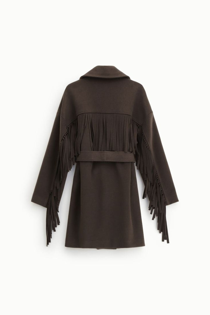 Gioca con la libertà di uno stile senza tempo con questo cappotto corto impreziosito da frange audaci. Perfetto per chi ama esprimere la propria personalità, avvolge e definisce la silhouette con una cintura annodata. Le maniche aggiungono movimento, mentre la struttura avvolgente invita al comfort. Prova a portarlo sopra un maglione grosso o abbinalo a jeans casual.
