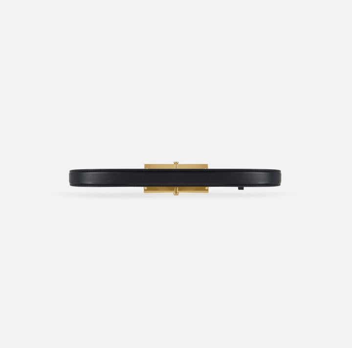 Cintura a vita alta realizzata in materiale sintetico effetto pelle. È impreziosita dalla fibbia ad ardiglione con logo in metallo dorato.