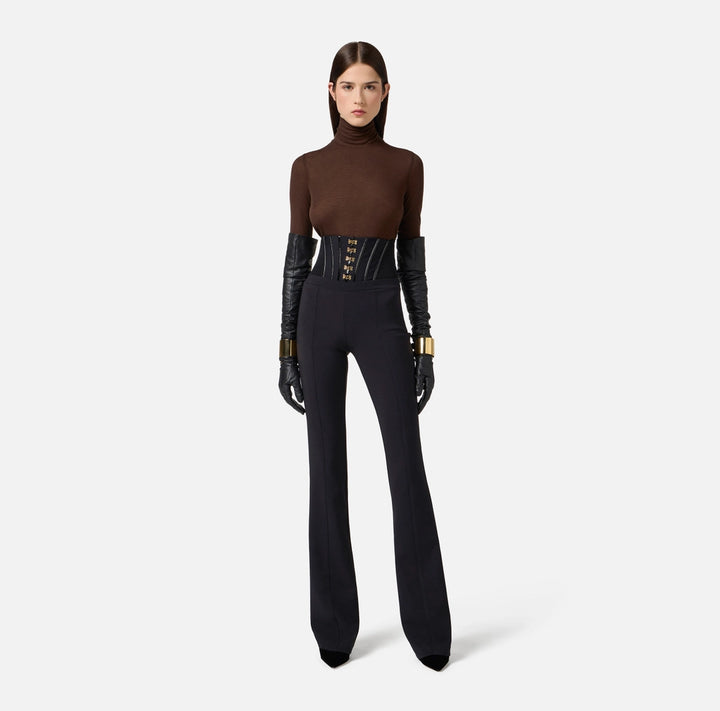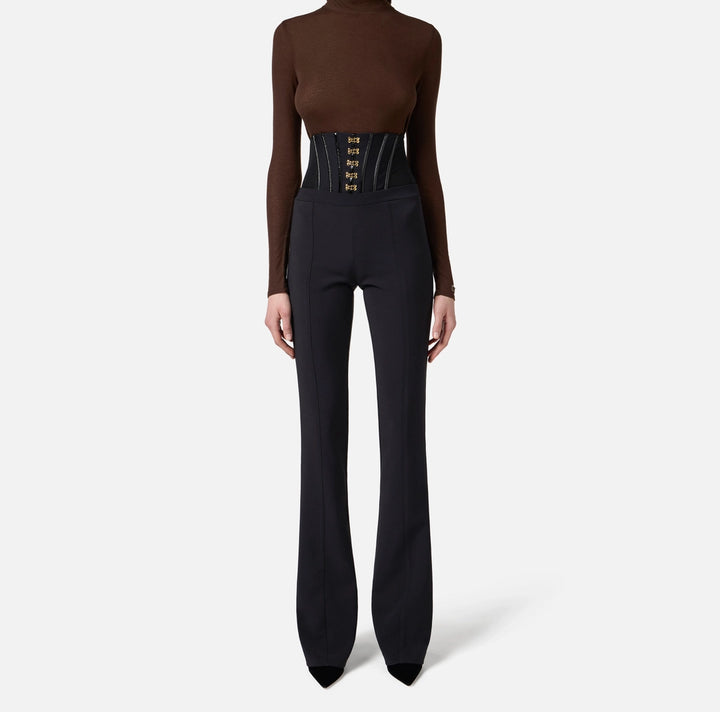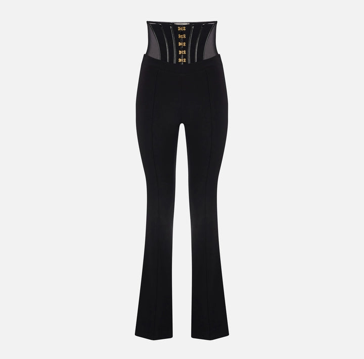 Pantaloni in crêpe leggero dalla vestibilità aderente con gamba svasata al fondo. Si distinguono per la vita alta con costruzione a bustier, definita da stecche interne, inserti in tulle e luminosi dettagli in vinile. I ganci in metallo dorato regalano un'ultima nota di luce.