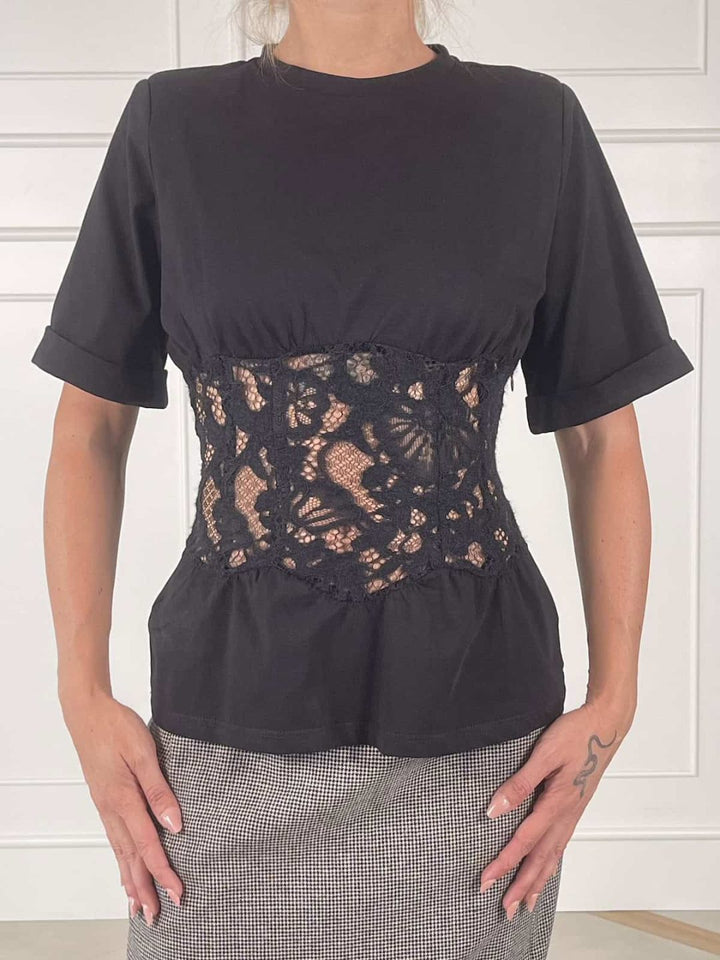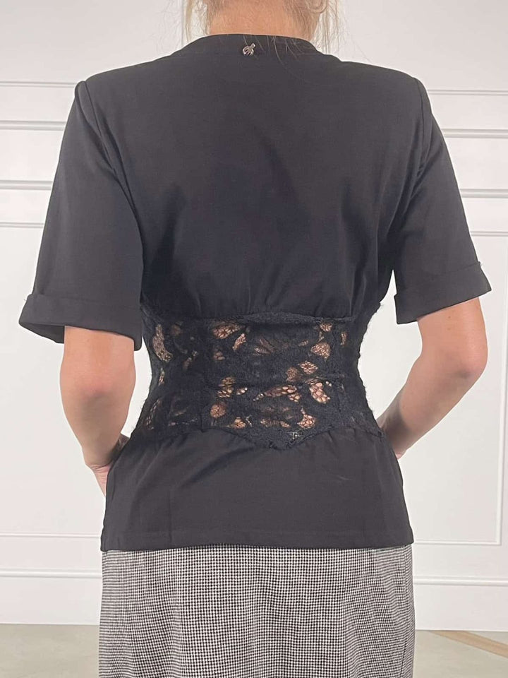 T-shirt in cotone stretch che unisce comfort e raffinatezza. Il tessuto elasticizzato garantisce una vestibilità aderente e confortevole, mentre l'inserto in pizzo sul petto aggiunge un tocco di eleganza sofisticato. Perfetta per chi ricerca un capo versatile che passa senza sforzo dal giorno alla sera, mantenendo sempre un'allure curata e distintiva.