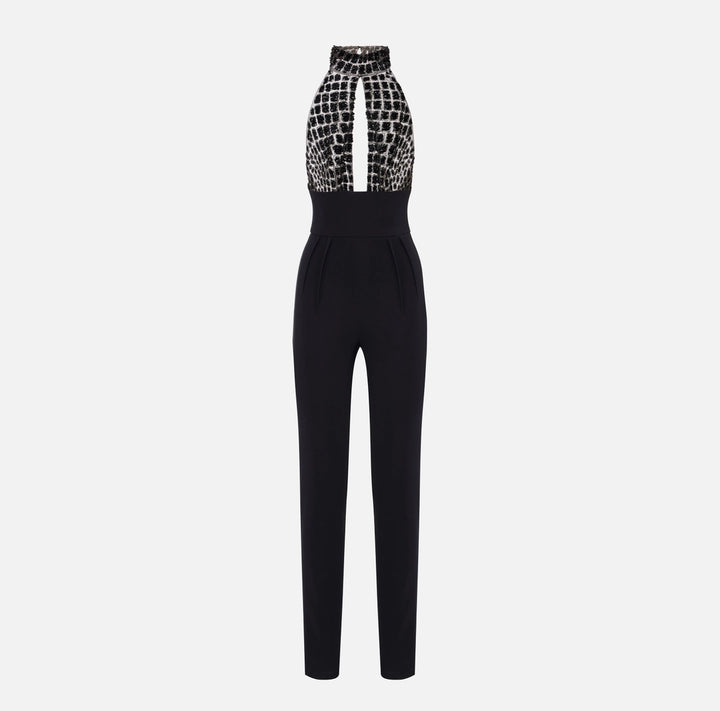 Tuta dalla vestibilità aderente con scollo all'americana. Il top è realizzato in tulle ed è impreziosito da brillanti ricami con disegno cocco, a donare luce e tridimensionalità alla texture. I pantaloni in crêpe hanno vita alta con nervature che donano definizione e fondo con caviglia morbida.